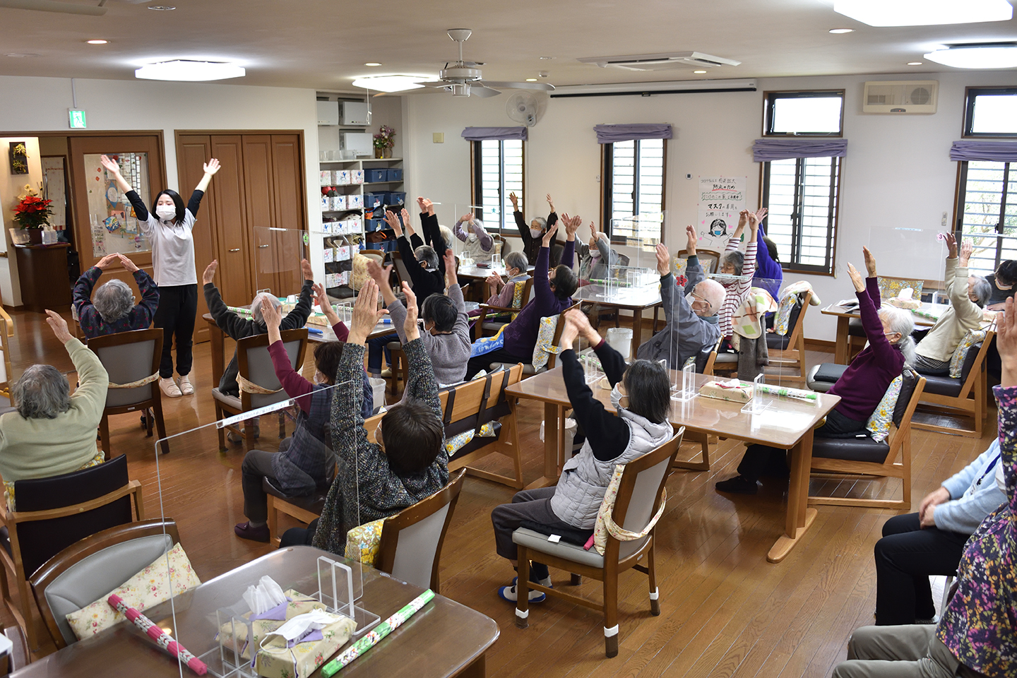 集団体操、個別訓練、屋外散歩、認知予防体操、ドライブ活動、レクリェーション等多くの機能訓練メニューを用意して、利用者の皆様に合った活動を行っています。